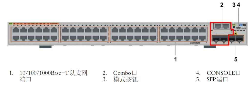 ZXR10 5250-52TC采用1 U(1 U=44.45 mm)高度的盒体,提供交流机型和直流机型。