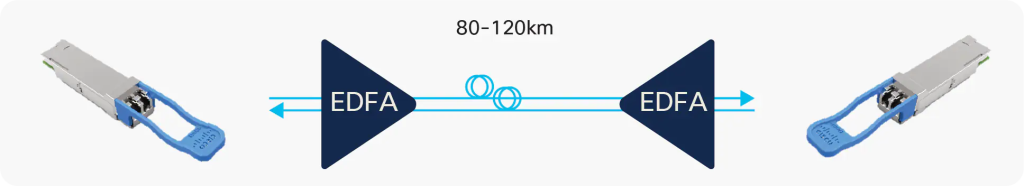 QSFP-DD ZR变体符合OIF MSA,允许与符合相同MSA标准的等效组件兼容。ZR标准的关键应用是允许使用多路复用器/多路复用器和放大器在点对点拓扑中传输400G波长,传输距离可达120km,如下所示。